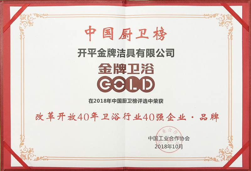 中國廚衛榜改革開放40年衛浴行業40強企業·品牌證書
